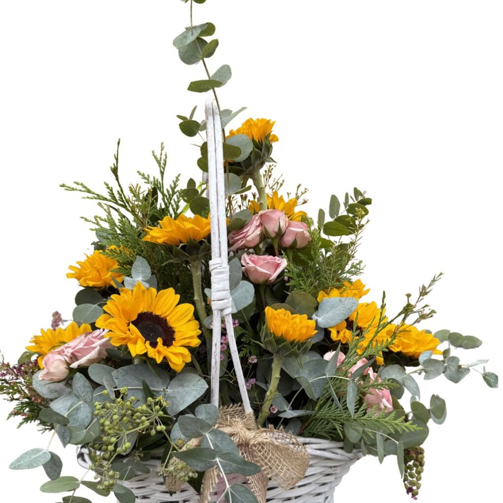 Cesta de flores naturales con girasoles y rosas, acompañada de verdes ornamentales en una elegante base de mimbre. Un arreglo floral luminoso y sofisticado, ideal para regalar en cumpleaños, celebraciones o sorprender con un detalle especial lleno de alegría.